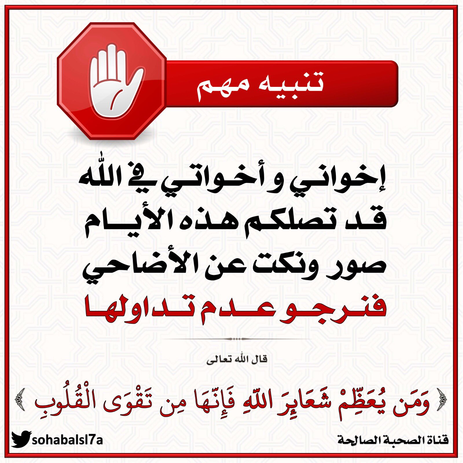 الصحبة الصالحة Sur Twitter تنبيه هام إخواني و أخواتي في الله قد تصلكم هذه الايام صور ونكت عن الأضاحي فنرجو عدم تداولها