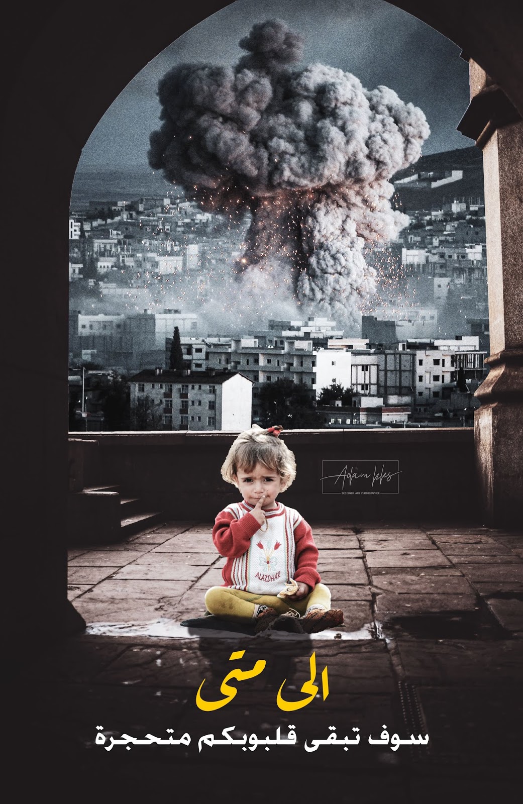 صورة معبرة عن اطفال سوريا تحت القصف وبلا مأوى الى متى المصمم ادم حلس